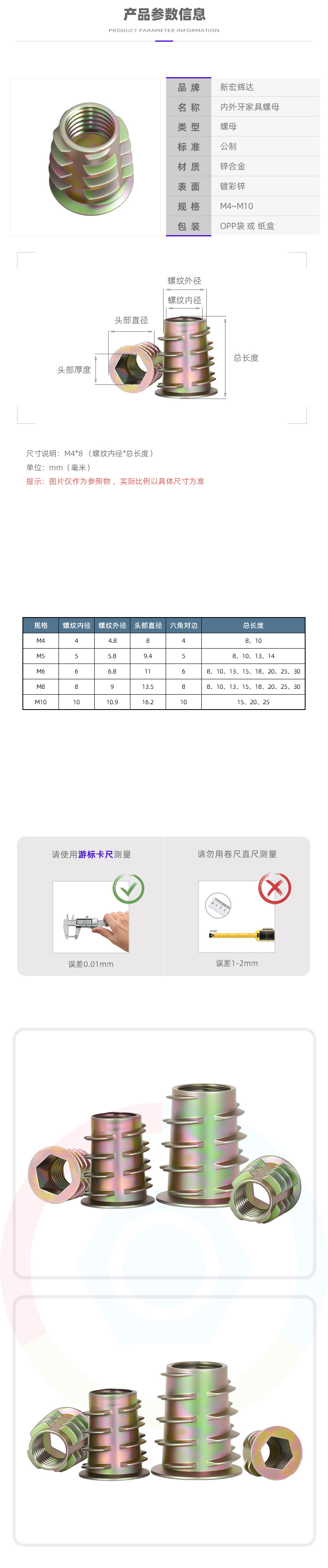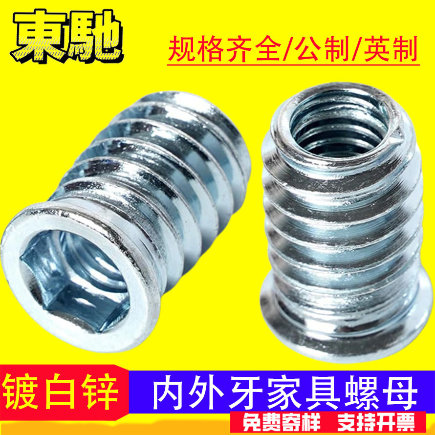 亜鉛合金内外ネジナット、木製家具金物、六角穴付きナット、埋め込み型台形ナット、M4、M5、M6、M8、M10