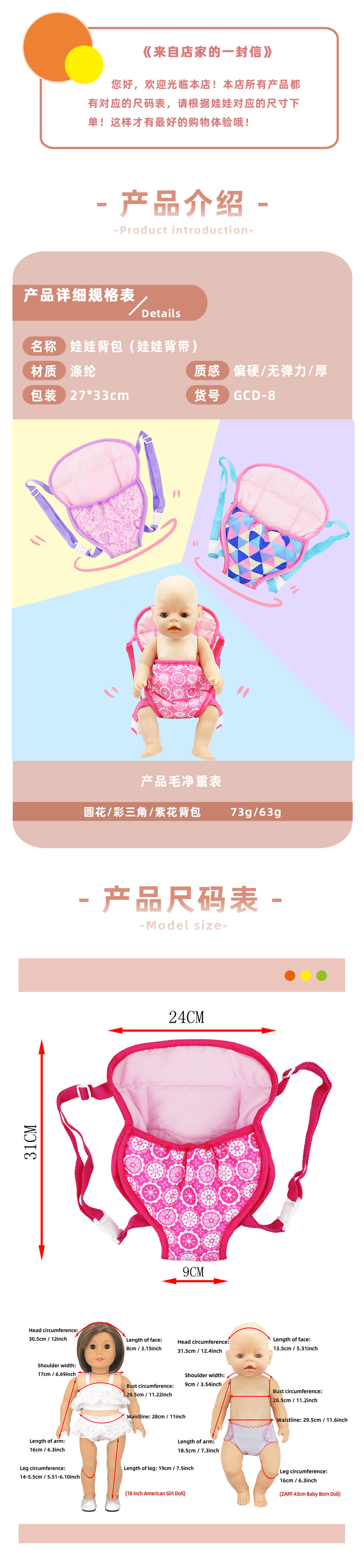 跨境厂家直供18寸美国女孩娃娃背包背带43cmbabybonx配件儿童包