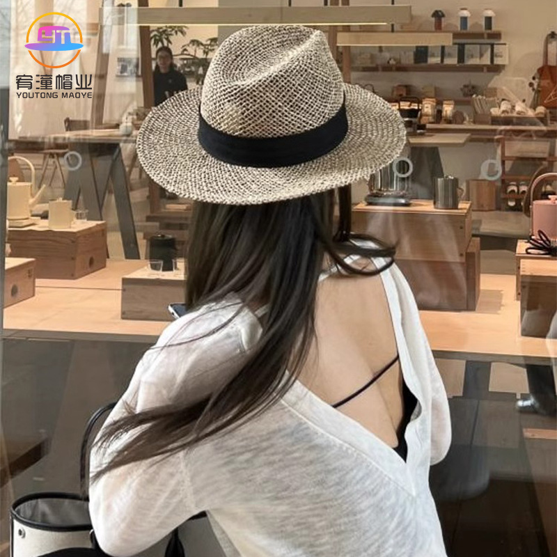 巴拿马草帽法式复古时尚草帽女夏季名媛法式天然咸草平檐遮阳礼帽