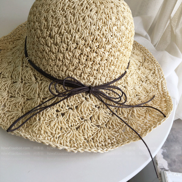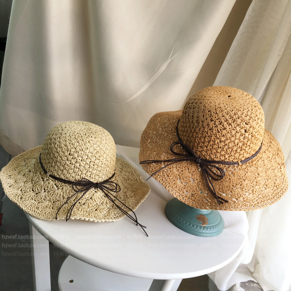 韓国の手編みの女性の麦わら帽子の大きい縁は折り畳みの砂浜の帽子の海辺の蝶結びの日よけの帽子のファッションの韓国版の女性の夏です。