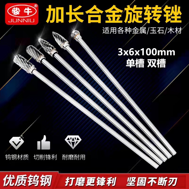 超長超硬ロータリーバーミル、金属研削ヘッド3mm*6*100セット、超長タングステン鋼研削ヘッド
