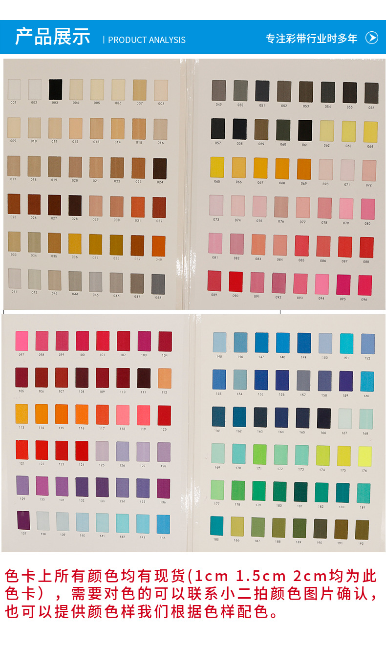 規格型番 2cm*ブラック*最小ロット数 100m,2cm*オリジナルホワイト*最小ロット数 100m,2cm*ブリーチカラー*最小ロット数 100m,2cm*001-096色*ご注文の際、備考欄に色番号をご記入ください。色見本をお送りして確認することも可能です。,2cm*097-192色*ご注文の際、色番号を備考欄にご記入ください。色見本をお送りすることも可能です。,1cm*ブラック,1cm*オリジナルホワイト,1cm*ブリーチカラー,1cm*001-096色*ご注文の際、色番号を備考欄にご記入ください。色見本をお送りして確認することも可能です。,1cm*097-192色*ご注文の際、色番号を備考欄にご記入ください。色見本をお送りして確認することも可能です。,1.5cm*ブラック,1.5cm*オリジナルホワイト,1.5cm*ブリーチカラー,1.5cm*001-096色*ご注文の際、色番号を備考欄にご記入ください。色見本をお送りして確認することも可能です。,1.5cm*097-192色*ご注文の際、色番号をメモしてください。確認のための色サンプルをお送りします。