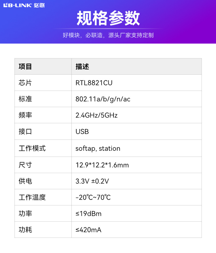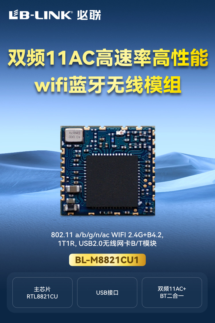 此款模块使用RTL8821CU方案,USB接口 3.3V供电,双频11AC 600Mbps传输速率,2.4G+5.8G频率 wifi+蓝牙,BT支持4.2,模块适用于平板电脑,笔记本电脑,阅读器等网络摄像机,机顶盒等;适用于智能电视机,高清4K电视,智能影院投屏设备;消费电子设备或智能家电(电视,DVD播放机、OTT、机顶盒、IPTV等).专业wifi4 wifi5 wifi6 wifi7模组生产商