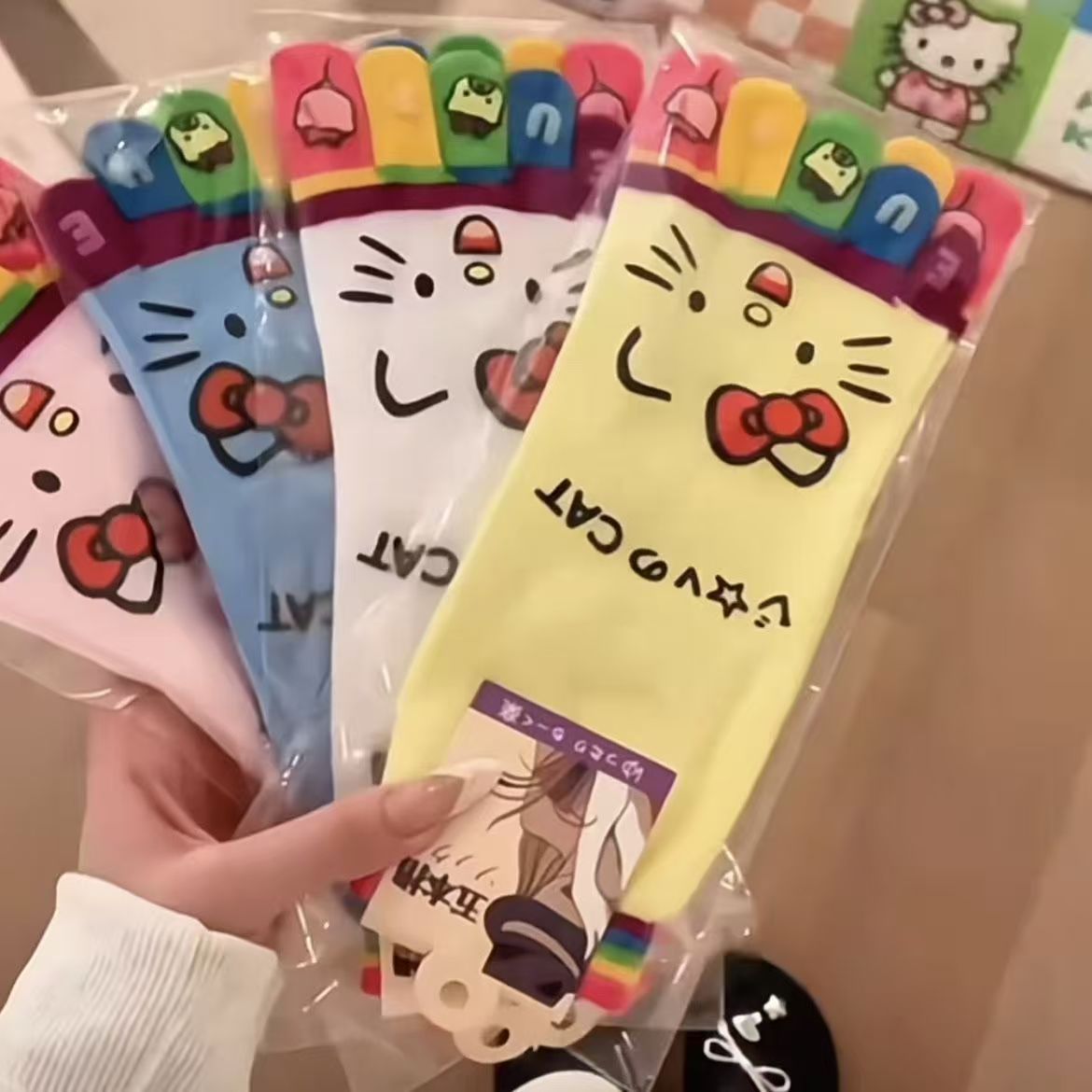 非常可爱的一款五趾袜哦,日式卡通图案,有六个款式可选,每款6色,12双一个中包,6色平均混搭。