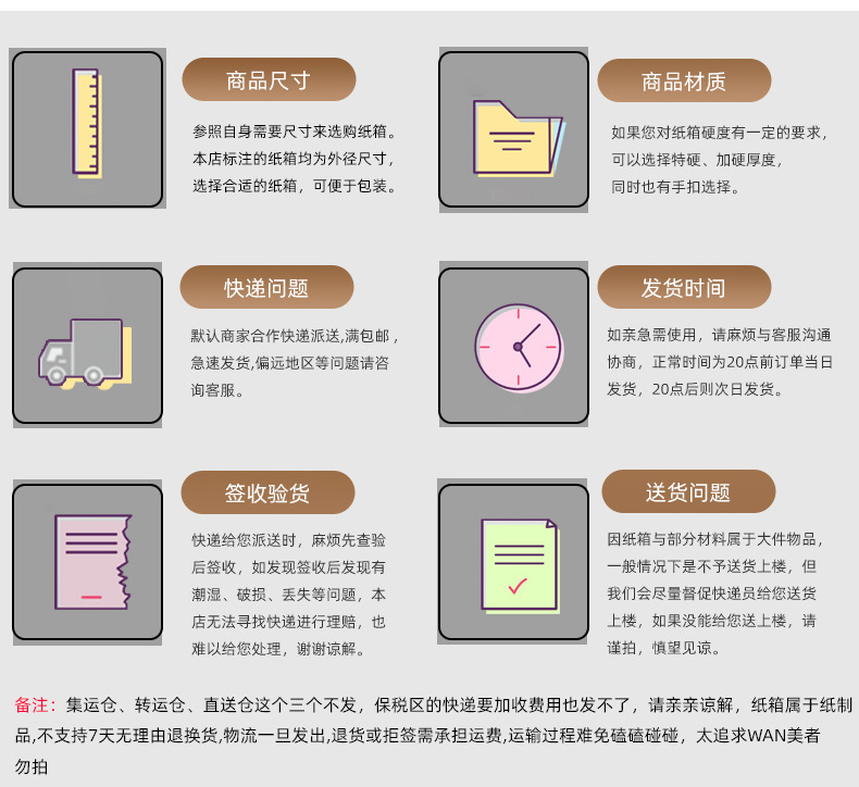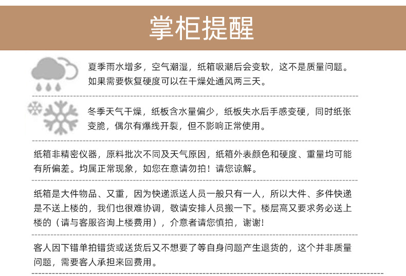 7、纸箱是纸制品,纸箱一旦发出,不支持7天无理由退换,请亲亲们注意