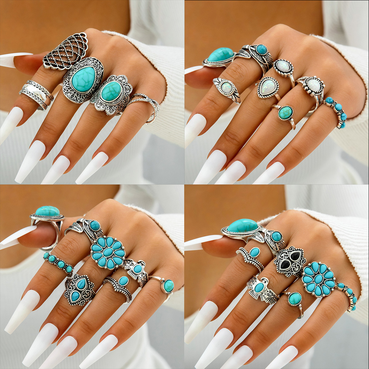 ボヘミアンレトロ幾何学ファッションオパール透かし彫りレリーフ象月星16点セット関節指輪