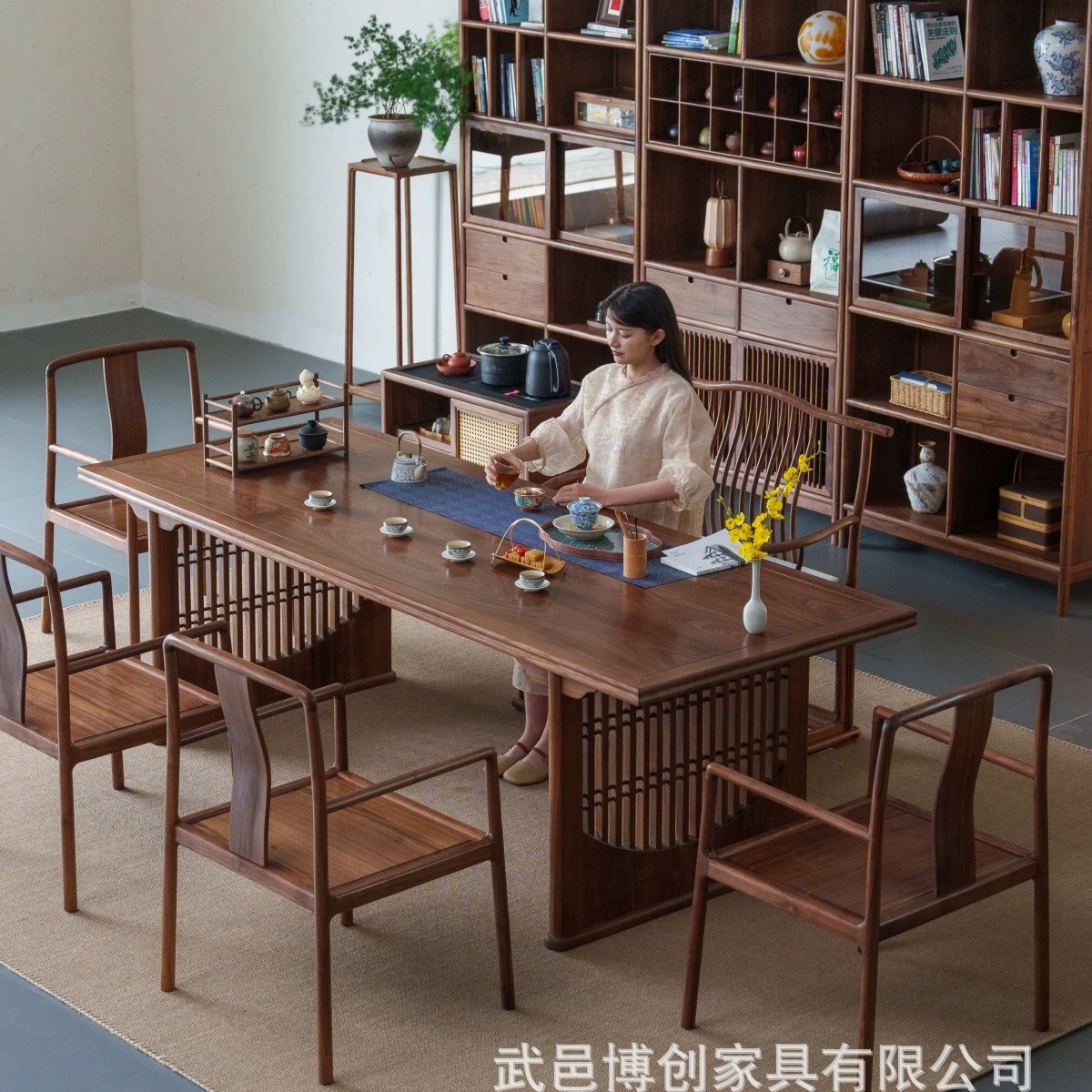 新中式古材茶卓椅子セット、明式黒胡桃色茶台、茶室家具専用茶テーブル