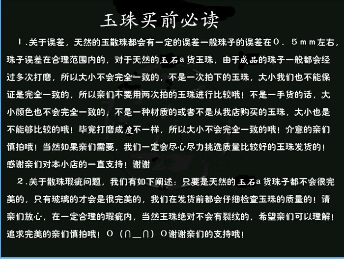 2、我们的每款产品均为实物拍摄,力求所拍摄的产品图片尽可能的接近实物,但相机,显示器不可避免存在色差,加上自然玉石,颜色自然形成,每一块都不同,批量加工产品实物与图片会存在少许色差!请您注意!