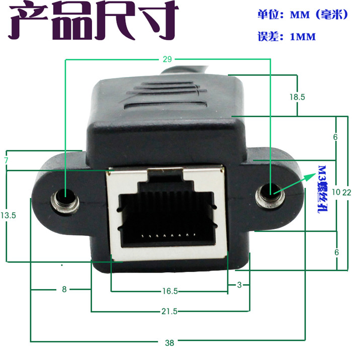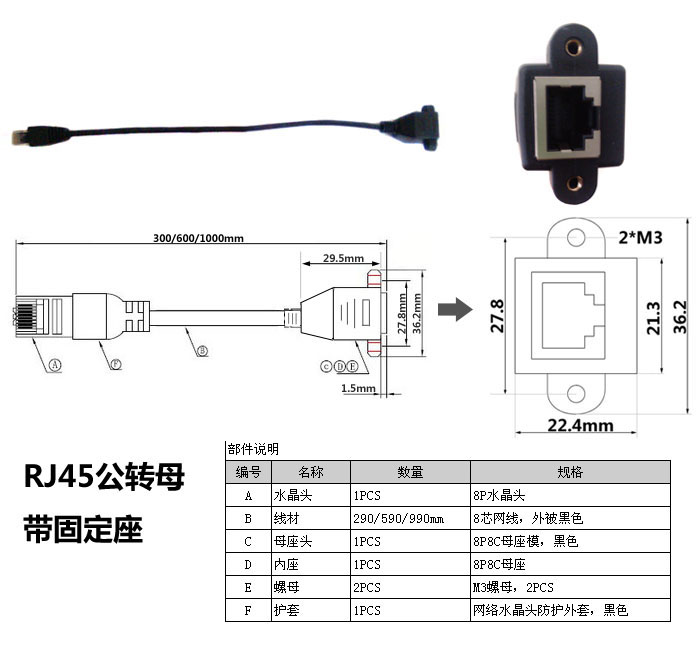 接口类型:RJ45 标准网络接口,公头采用防生锈屏蔽金属壳水晶头,母座带可螺丝固定的耳朵,方便用户生产线组装设备机箱。