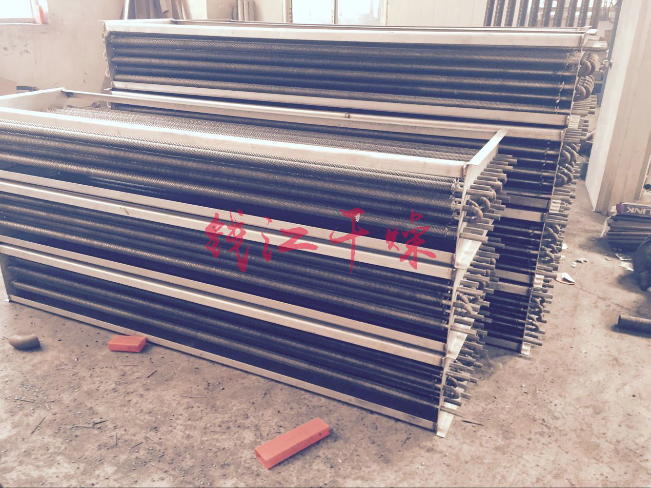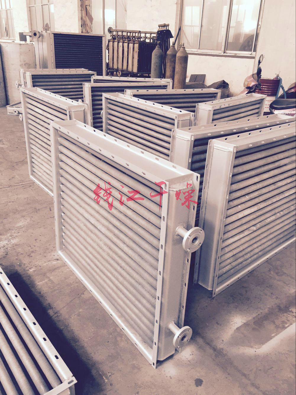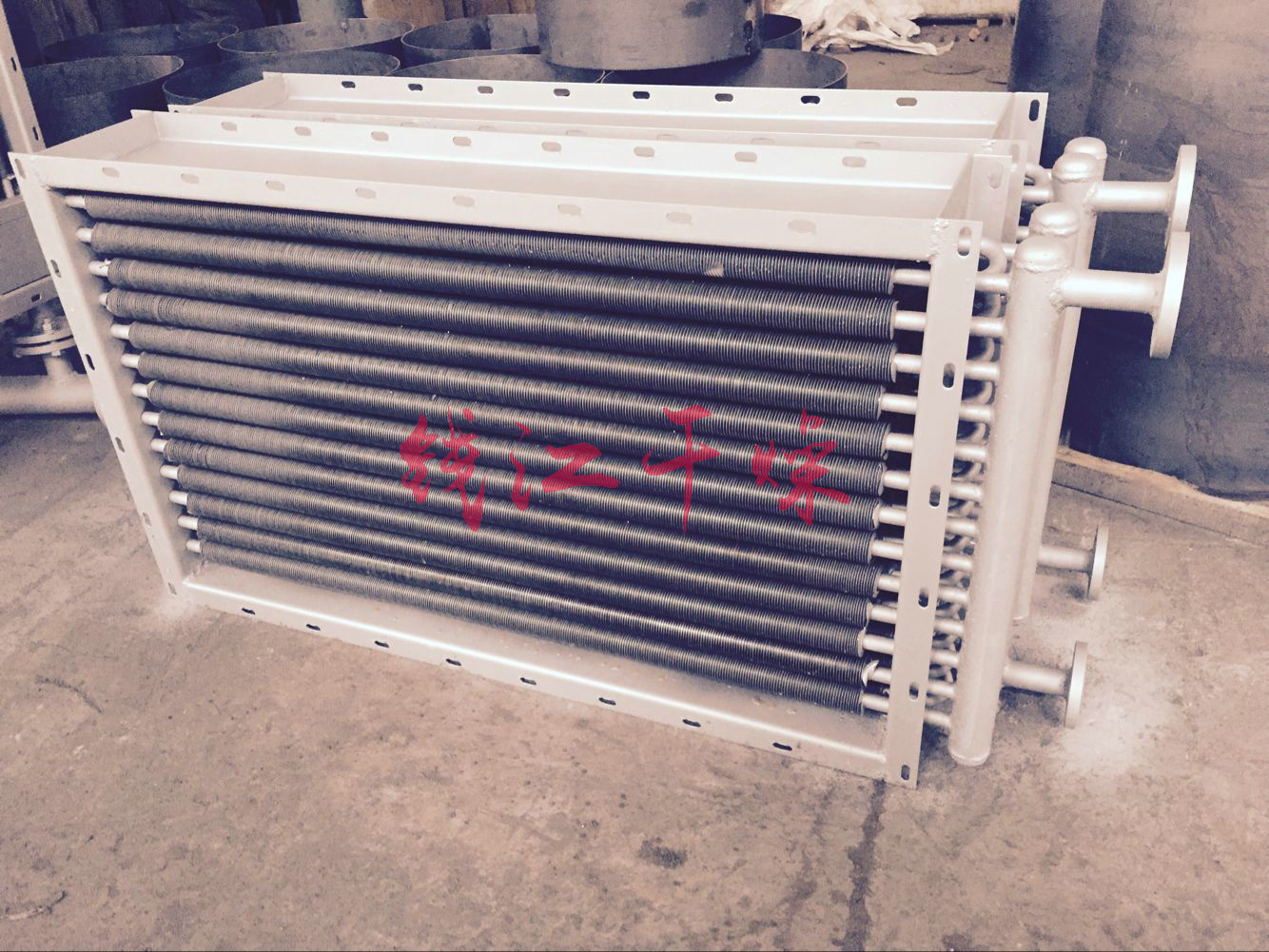 螺旋翅片散热器,主要用于干燥系统中空气加热,是热风装置中的主要设备,散热器采用的热介质可以是蒸汽或热水,也可以导热油,蒸汽的工作压力一般不超过0.8Mpa,热空气的温度咋150C以下。翅片式数热器与要由空气流向间的三排并列螺旋翅片管来组成,SRZ型散热翅片管来的加工工艺是把0.5*10毫米的钢带用机械绕片方法,绕在18毫米无缝钢管上,然后进行热缓锌,也可用不锈钢及不锈钢带制成不锈钢散热器,SRL散热器则是用钢管和铝带轧制的翅片散热器。其单位长度的散热器面积比SRZ型的更大。