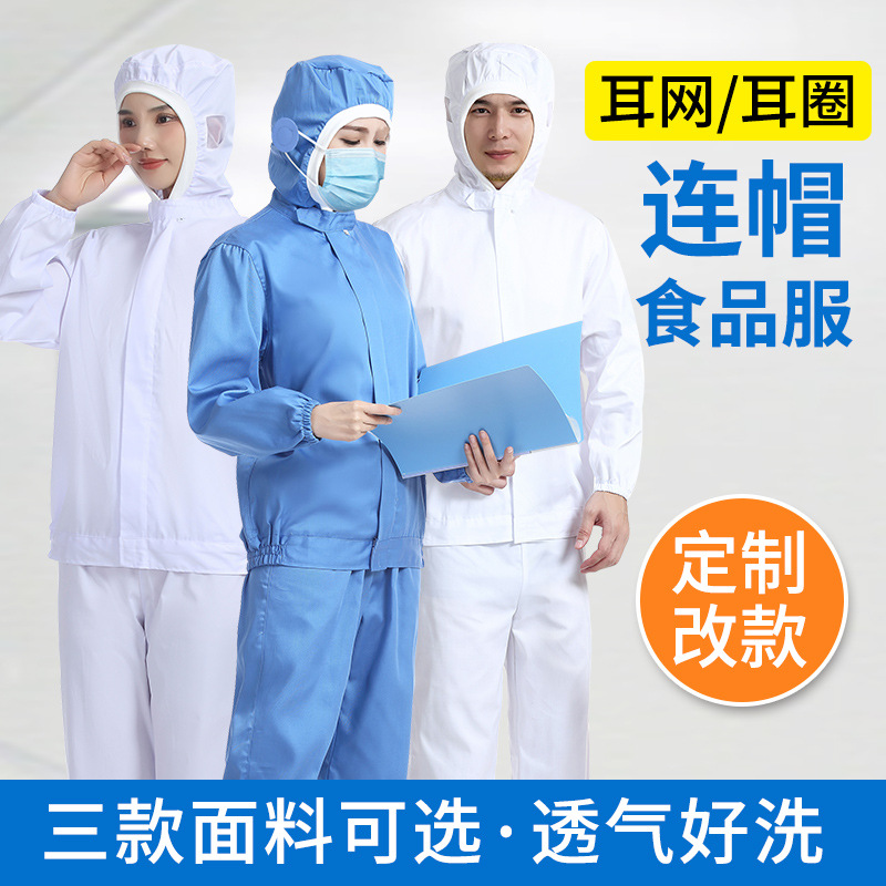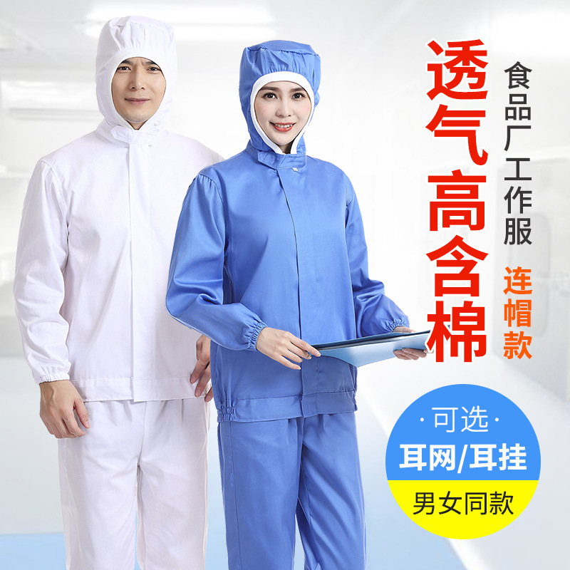 食品工場作業服フード付きスプリット白長袖食品服工場加工現場男女耳網通気耳輪