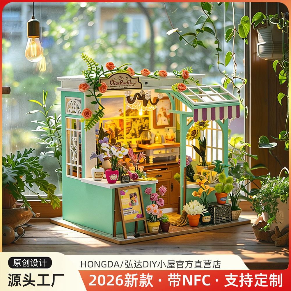 弘達越境木製DIY小屋ミニチュア花屋飾りマイクロ風景建築模型手作り組み立て玩具