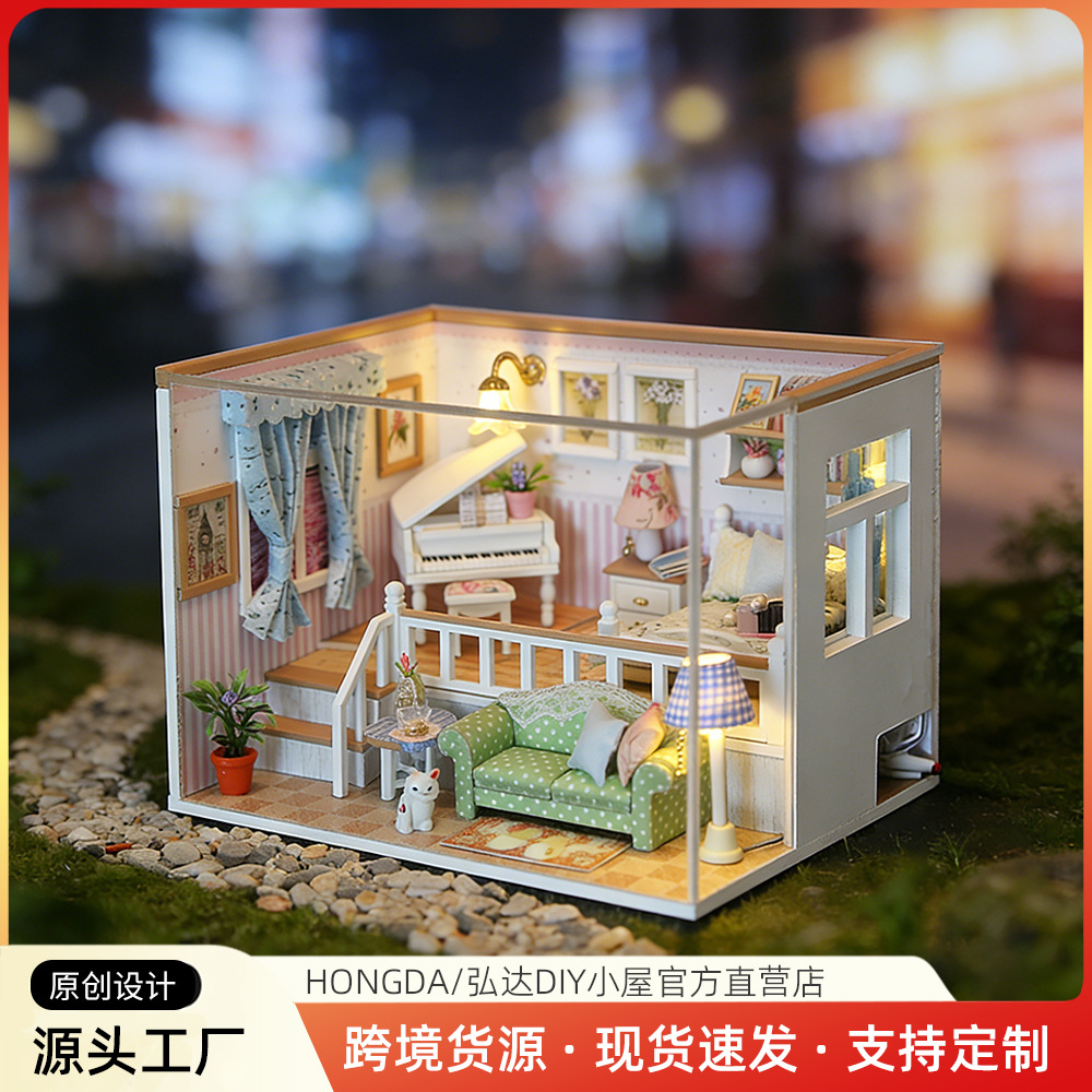 弘达跨境diy小屋模型屋微型手工拼插木质微缩木屋摆件玩具礼物