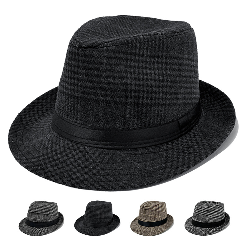 秋冬季复古英伦男士礼帽高级感格子毛呢保暖帽子中老年爸爸爵士帽