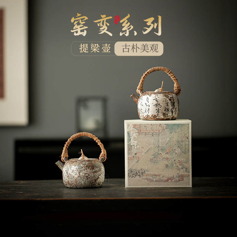 鎏银繁花茶壶陶瓷高档家用球孔过滤茶水壶创意藤编提梁壶粗陶单壶