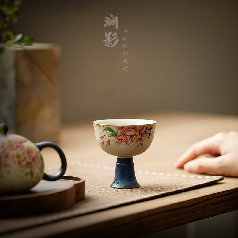 新中式牡丹闻香杯高颜值女士品茗杯陶瓷高脚杯个人专用主人杯茶盏