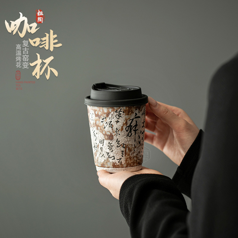 国潮风鎏银咖啡杯家用陶瓷茶杯带盖随身杯马克杯复古粗陶喝水杯子