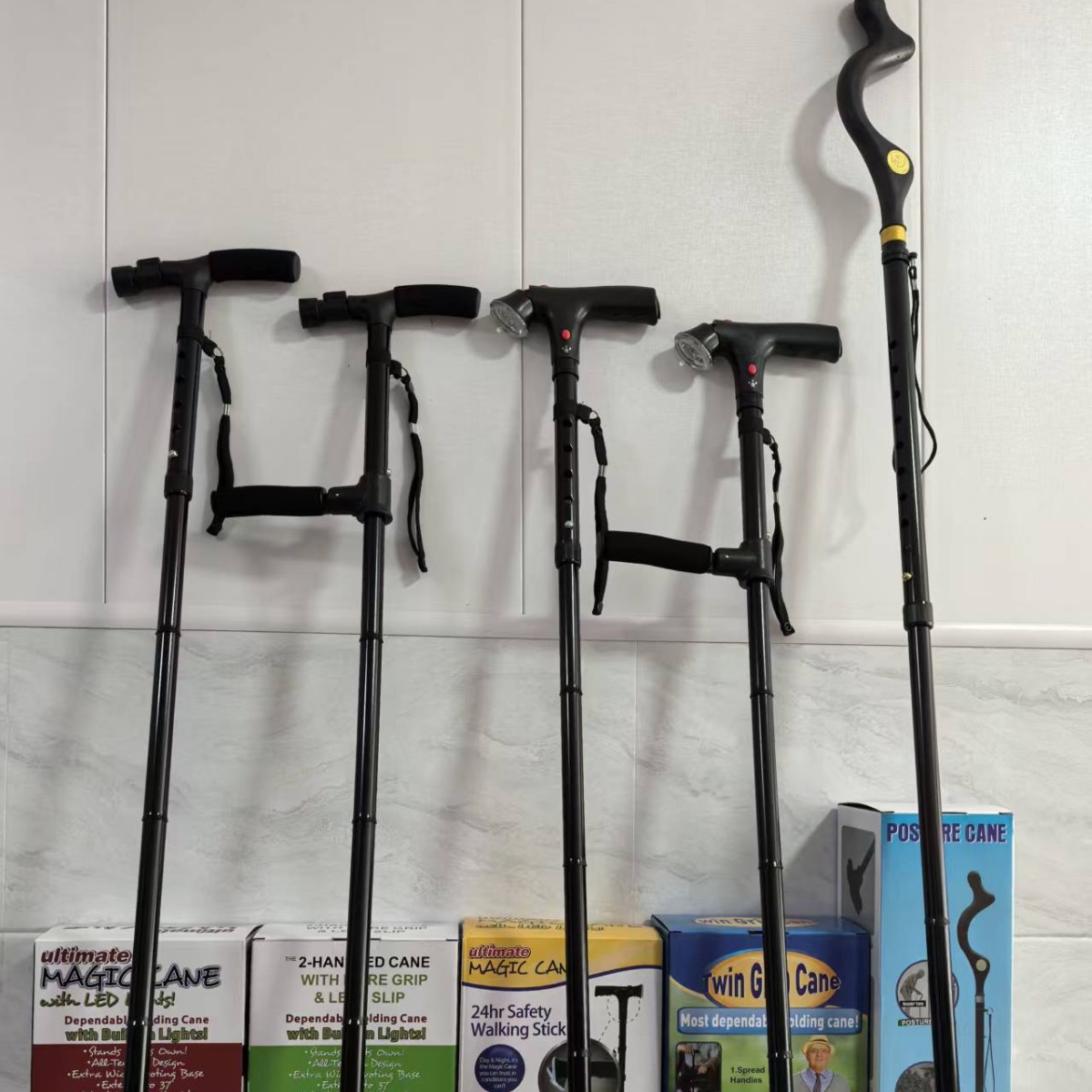 老年折叠拐杖 铝合金拐杖四脚不倒翁登山杖LED带灯TV Magic Cane