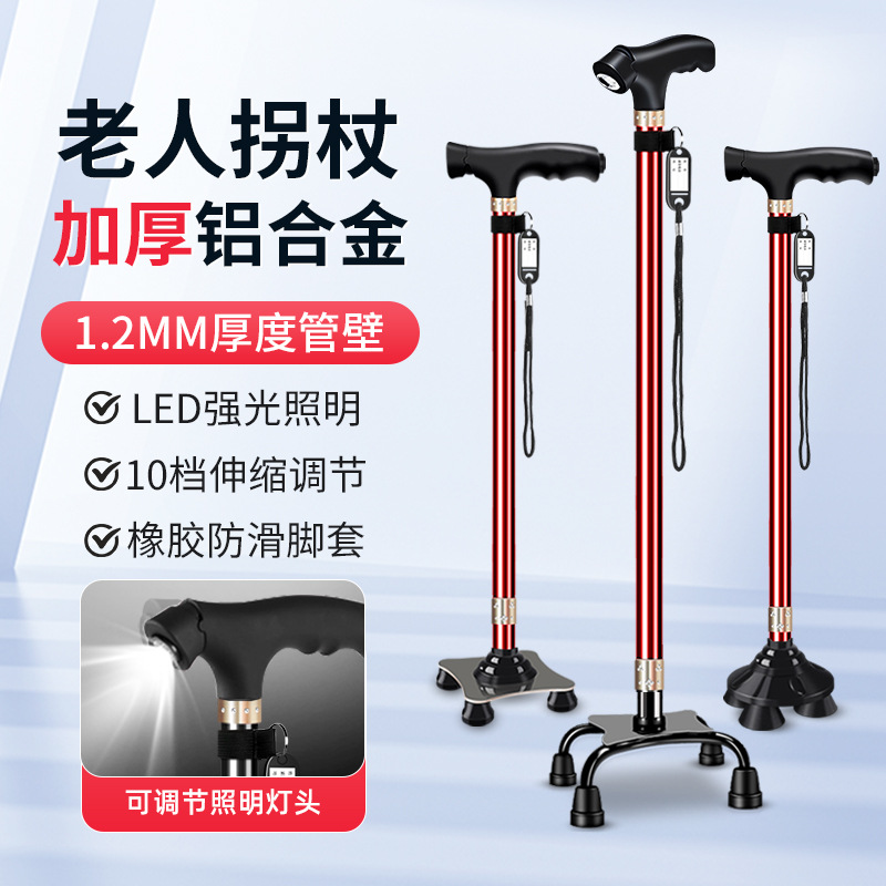 折り畳みランプ付きアルミ合金伸縮杖老人アウトドア用品にドリル四足杖多機能伸縮卸売り