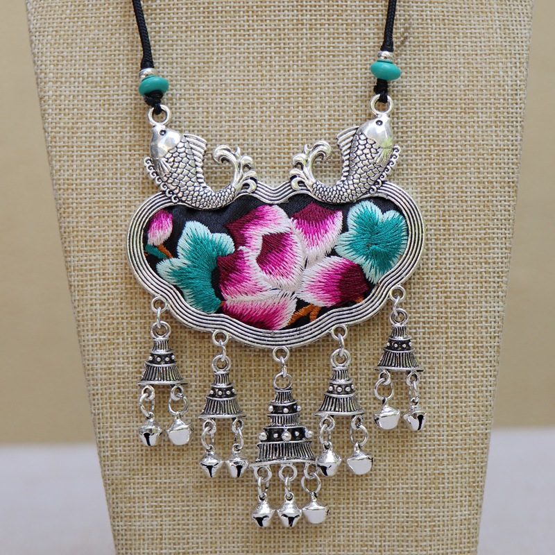 老绣片苗银饰品批发 原创手工老绣片苗银项链 复古圆形绣花吊坠