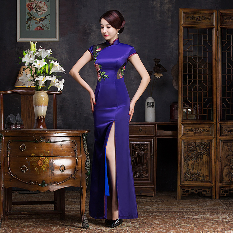 新商品の紫色の上品なシングルフォークの透かし彫りの長いタイプのチャイナドレスの女性の公演のショーのマナーのチャイナドレスの司会服