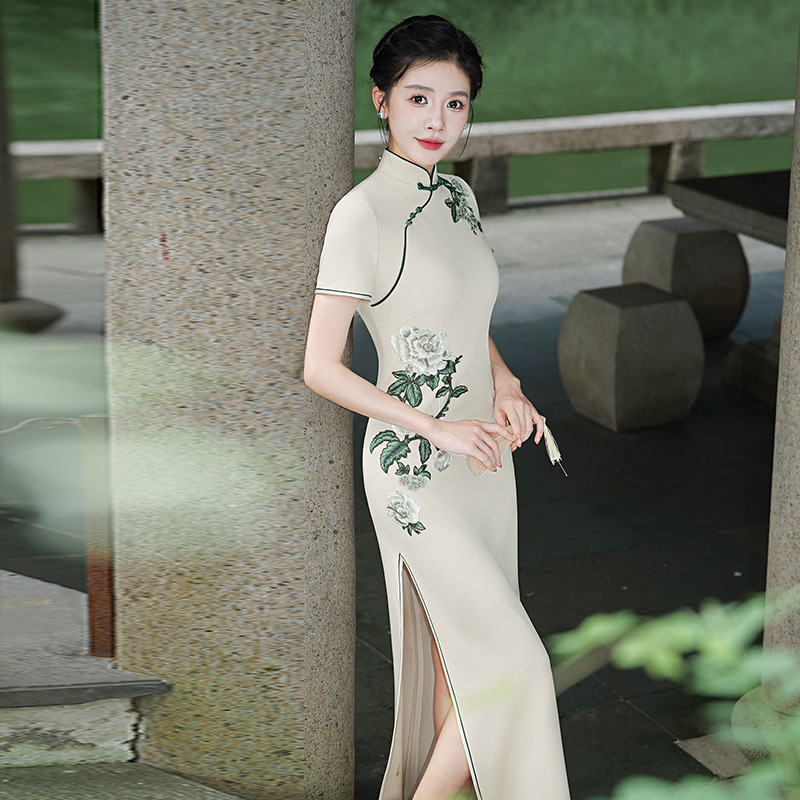 白色の新型の修身改良高開叉の長いタイプのショーのチャイナドレスの表の演出服の舞台のお母さんの服装の宴会の女性
