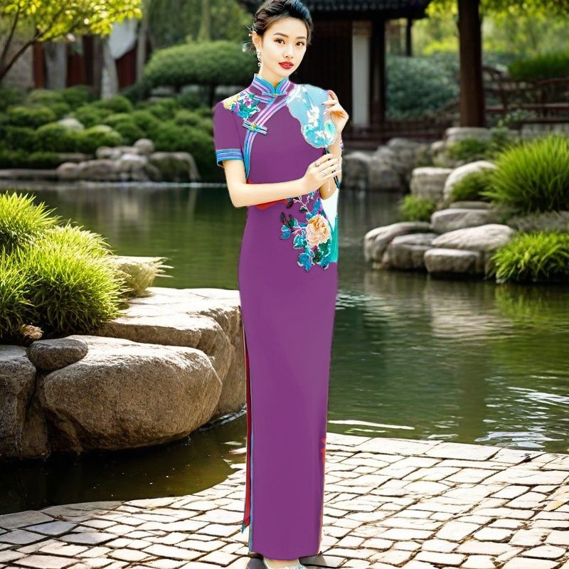 紫の改良チャイナドレスのワンピース2025年の新型レトロ中国風の長いファッション舞台のショーの演出服
