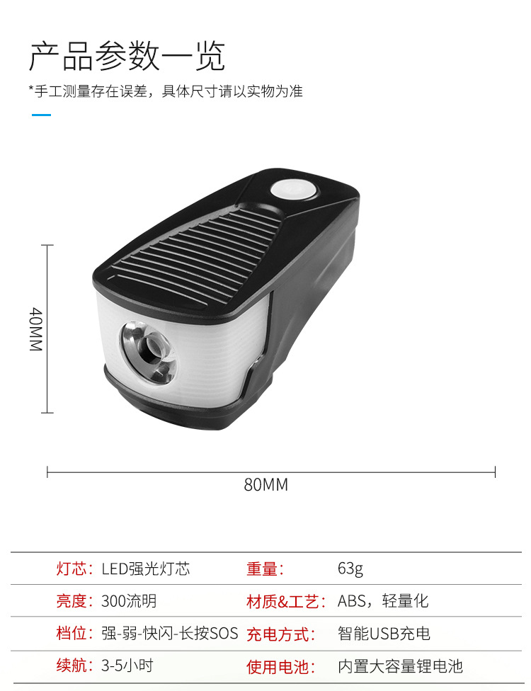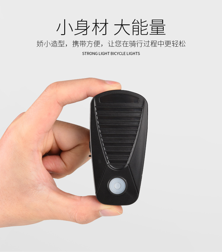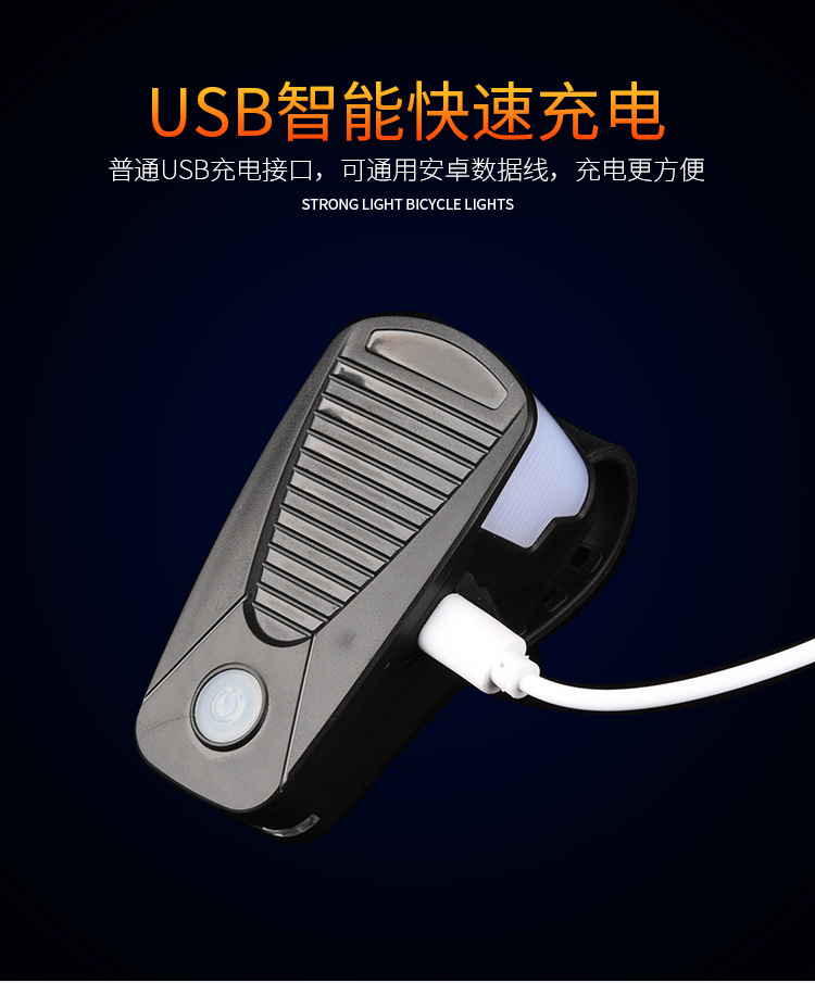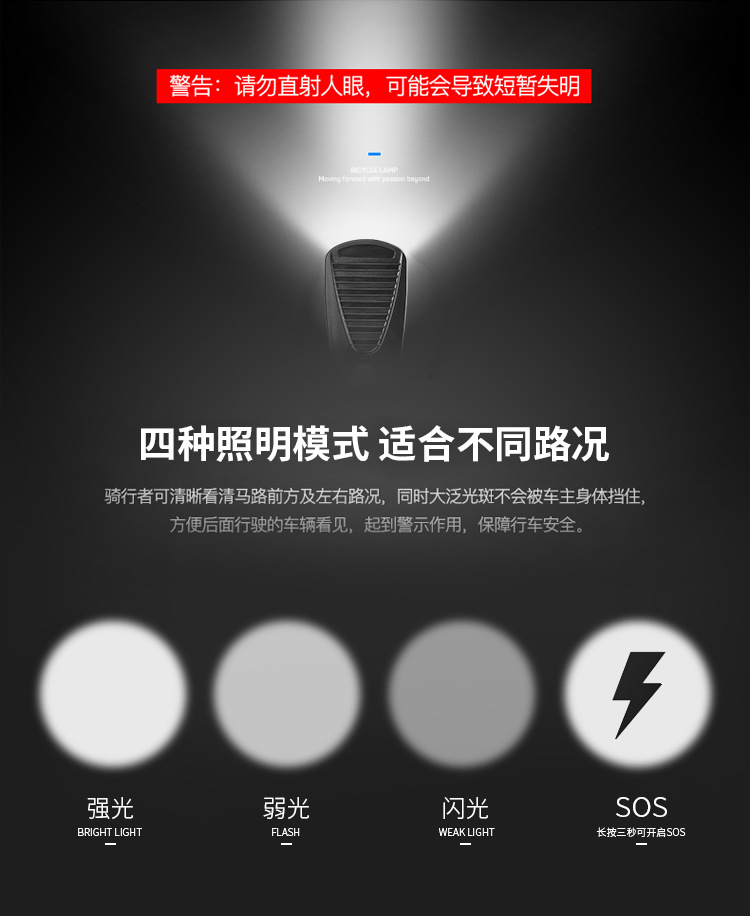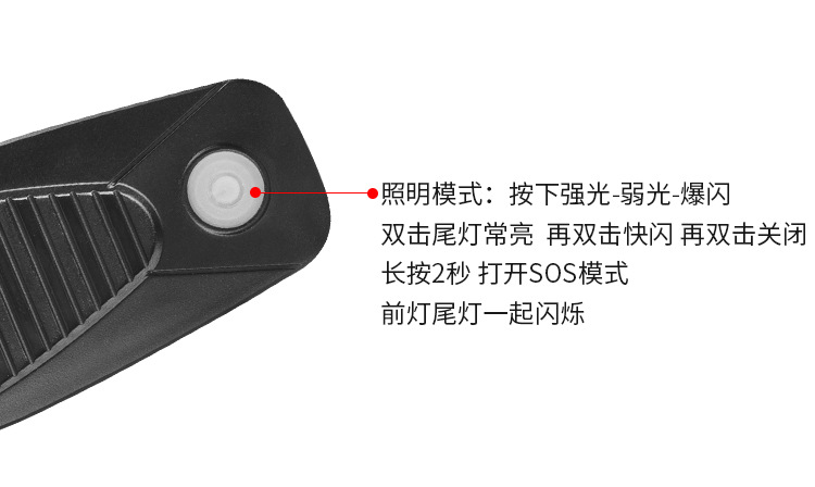照明模式:按1下强光-弱光-爆闪 双击尾灯常亮再双击快闪再双击关闭 长按2秒打开SOS模式前灯尾灯一起闪烁