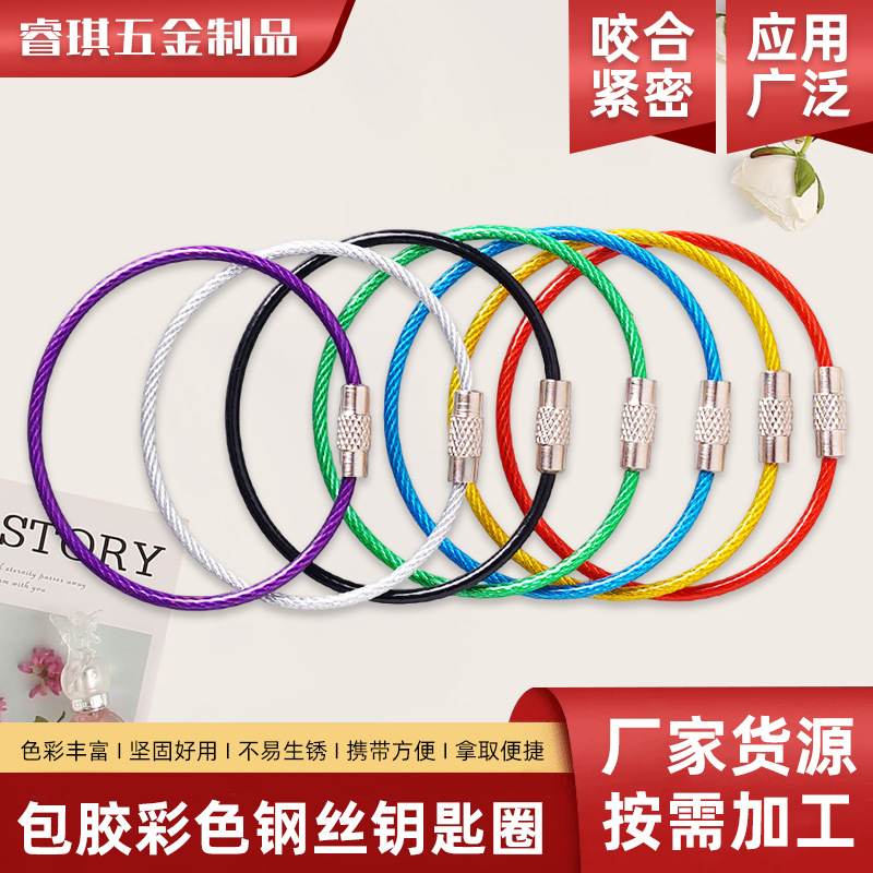 亚马逊钢丝绳圈钥匙扣不锈钢彩色包胶钢丝圈钢丝锁扣卡通钥匙挂绳