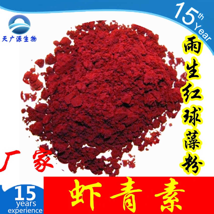 【生物来源】:天然虾青素的生物来源一般有3种:水产品加工工业的废弃物、红发夫酵母 (Phaffiarhodozyma)和微藻(雨生红球藻)。雨生红球藻被公认为自然界中生产天然虾青素的生物,因此,利用这种微藻提取虾青素无疑具有广阔的发展前景,已成为近年来国际上天然虾青素生产的研究热点。其中,废弃物中的虾青素含量较低,且提取费用较高,不适于进行大规模生产。天然的红发夫酵母中虾青素平均含量也仅为0.30%