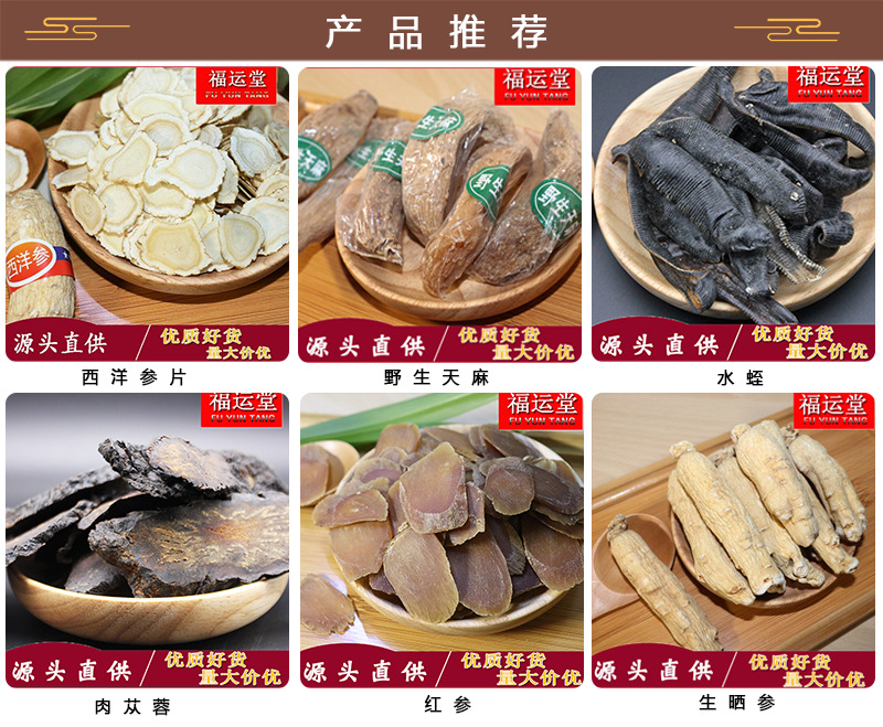 亳州市福运堂参茸行坐落文化底蕴优厚的古都-亳州 本公司线下50多年药材销售把关经验。储存仓库占地2000平方, 经销批发的西洋参、人参、红参、水蛭、三七、天麻、花茶等药食同源中药材畅销消费者市场,在消费者当中享有较高的地位,公司与多家零售商和代理商建立了长期稳定的合作关系。亳州市福运堂参茸行经销的多种药食同源中药材品种齐全、价格合理。秉承着,重信用、守合同、保证产品质量,以多品种经营特色和薄利多销的原则,赢得了广大客户的信任。
