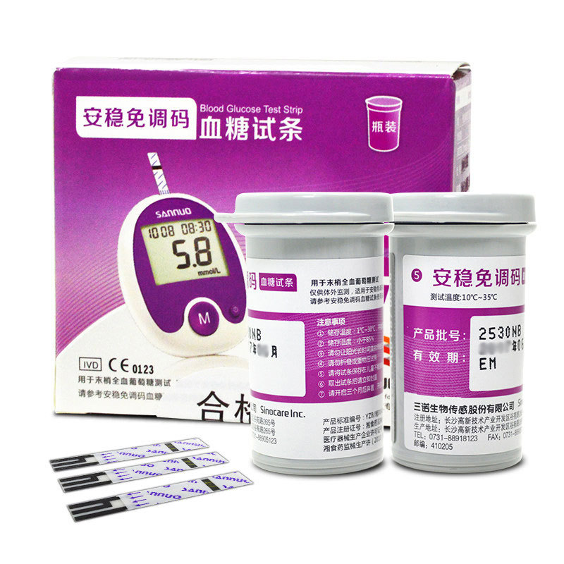 三诺安稳加+血糖试纸家用血糖测试仪免调码测试纸条100片装