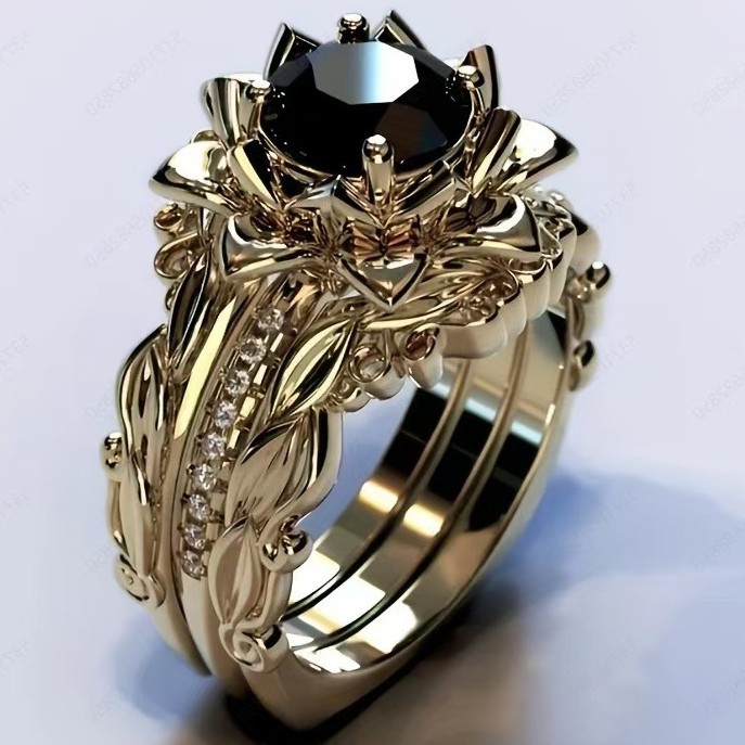 三傑は国境を越えて起爆した三点セットの指輪を販売してバラの女性セットの指輪をメッキして金色に黒ドリルのアクセサリーをはめ込んだ
