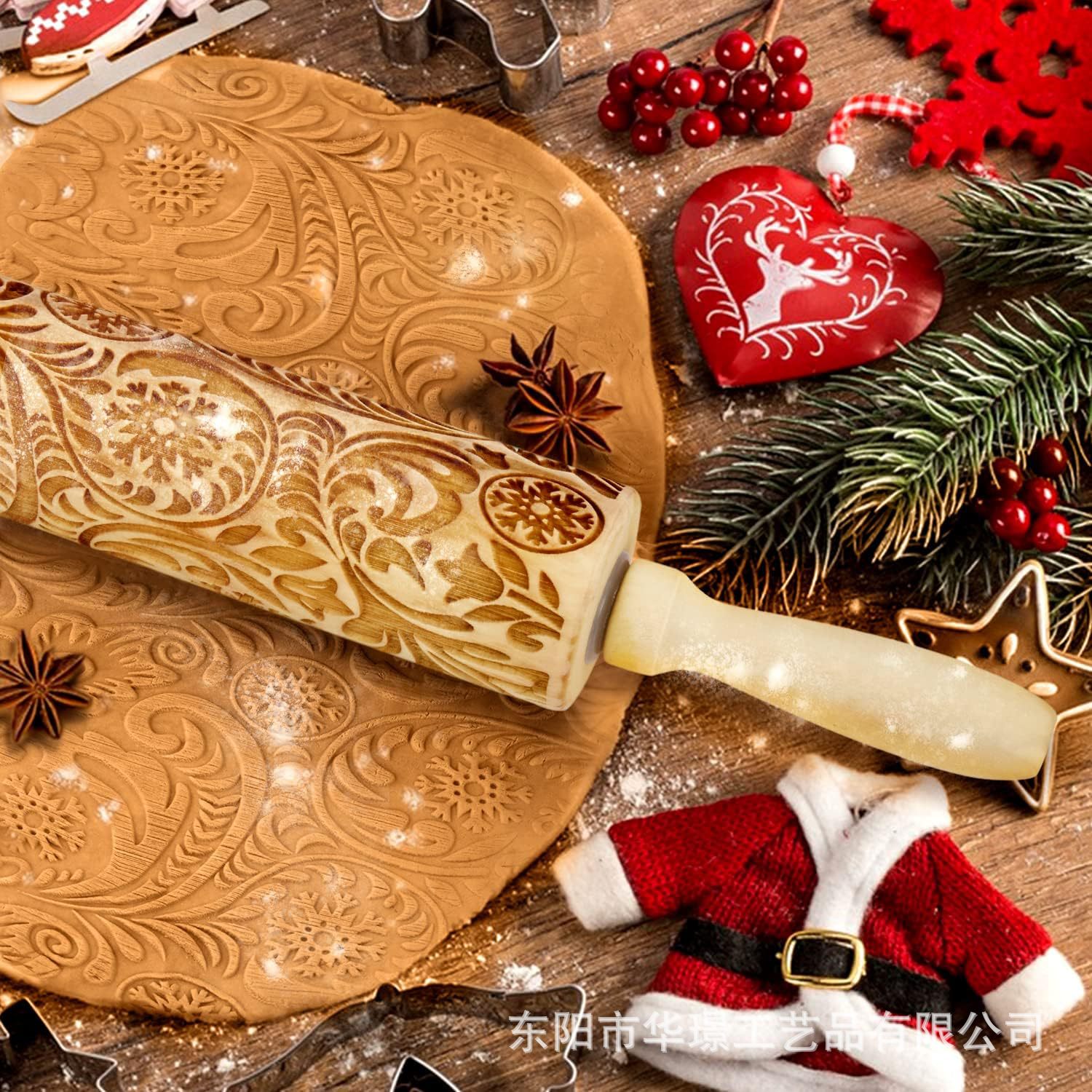 2024 木製クリスマスプリントローリングピン、木製彫刻エンボスローリングピン、クッキーローリングピン、工芸品