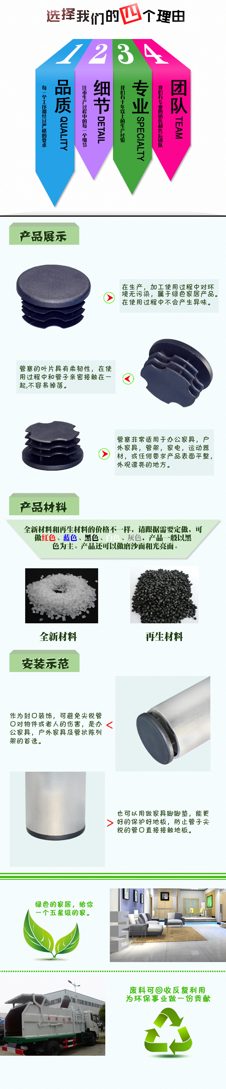本公司主要生产各类家具塑料配件,如:塑料管塞,家具管塞,圆管塞,方管塞,椭圆管塞,管外套,椅子脚套,弧面管塞,环保管塞,可调脚,地钉,沙发脚,吸杯,堵头,排骨架床胶套,电镀管塞,膨胀胶料,垫片,脚垫,轮子等等多种产品。