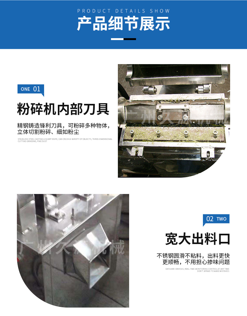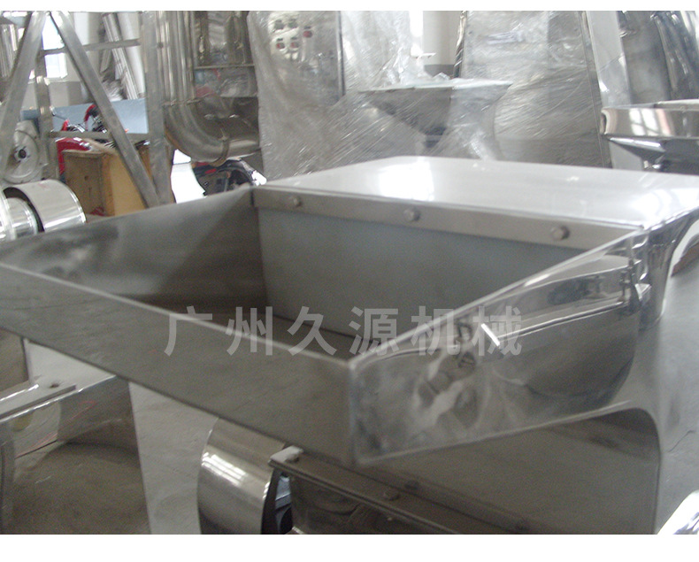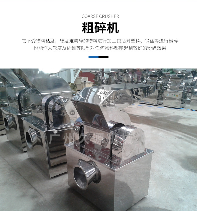 本粗碎机为卧式粉碎结构,物料由进料斗进入粉碎室,利用旋转刀与固定刀冲击、剪切而获得粉碎,经旋转离心力的作用,物料自动流向出口处。该机按“GMP”标准设计,整机全部采用不锈钢材料制造,结构简单、清洗方便、噪音低,是目前粗碎机中理想的设备。