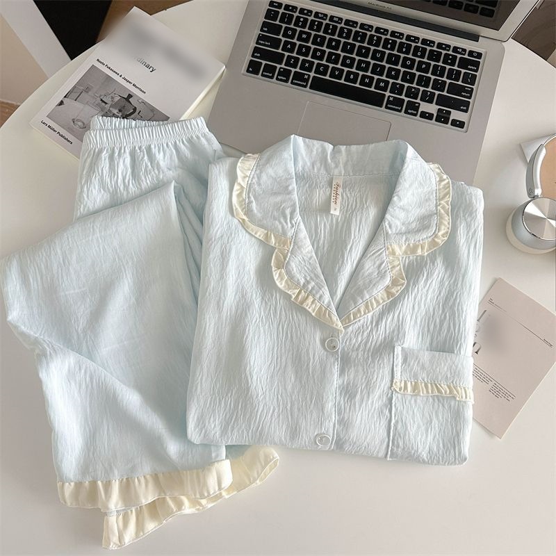 跨境热销睡衣女新款云朵棉春秋开衫纯色蕾丝边家居服套装量大优惠