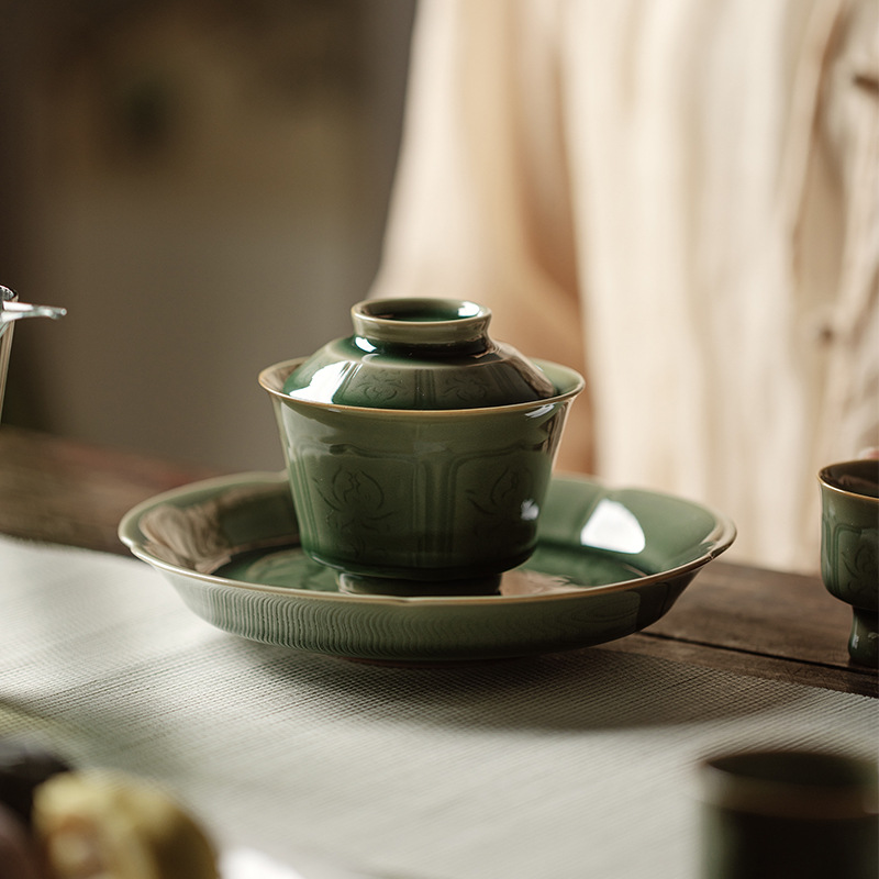 越窯梅子青セットの工夫茶器は簡単に碗をかぶせます。