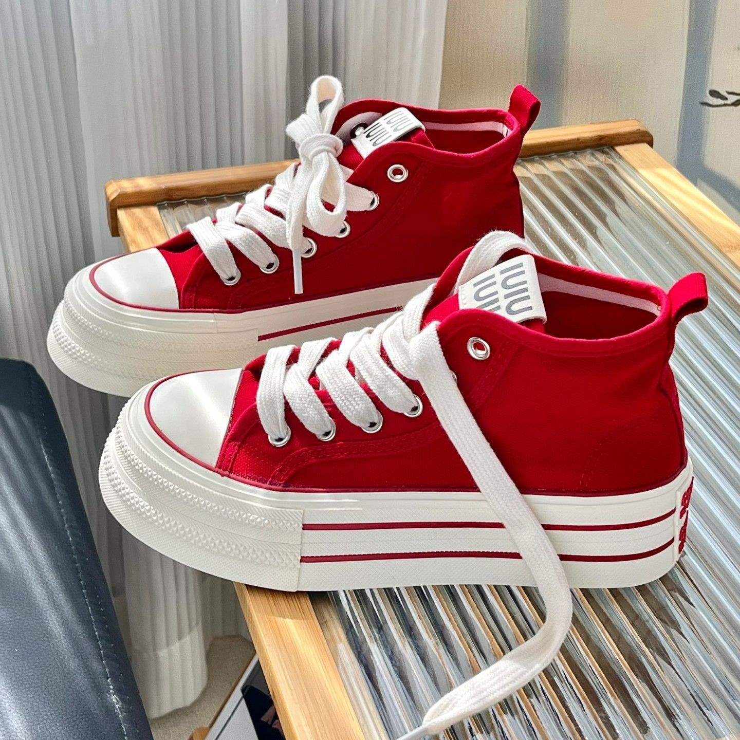 复古红色厚底高帮帆布鞋女2025春秋新款百搭增高松糕学生休闲板鞋