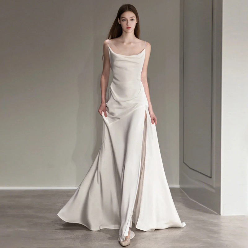 ストラップの軽いウェディングドレスの白いシンプルなセクシーな露背森系の旅は、門糸のフランスのサテンの小さな尾引きドレスのスカートを撮影します