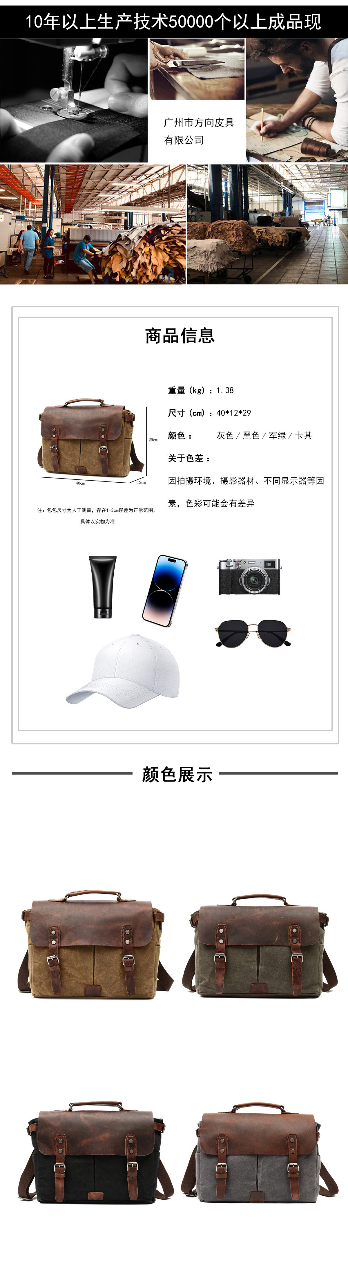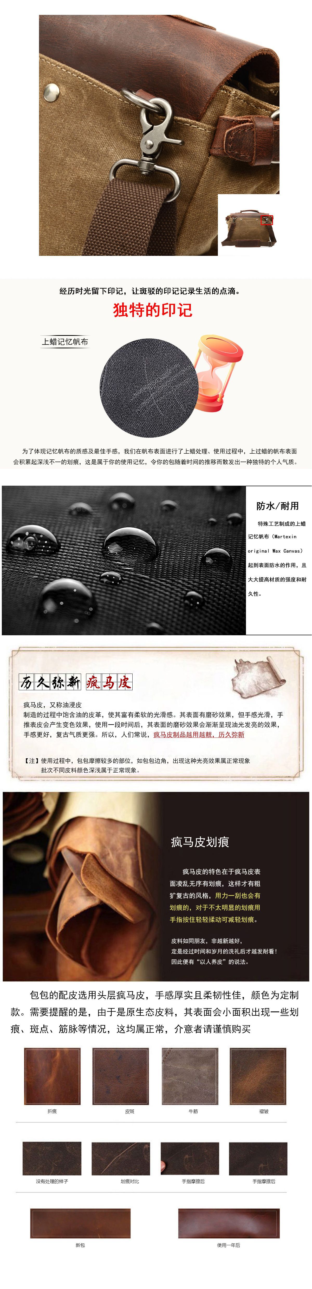欧美复古疯马皮拼接油蜡帆布手提公文包15寸电脑防水做旧斜挎包