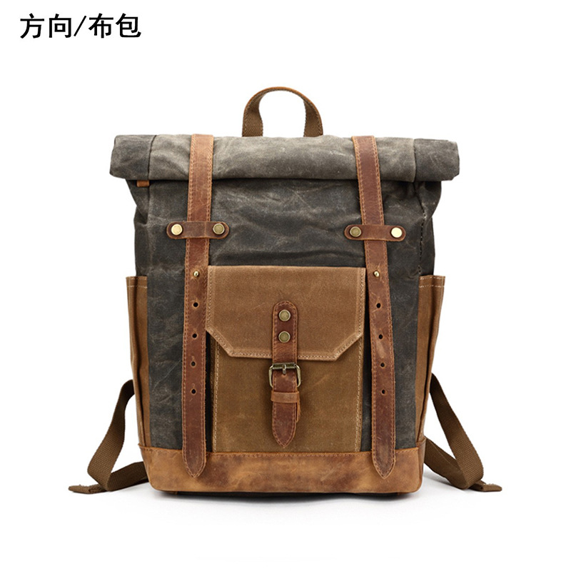 ヨーロッパとアメリカのレトロなオイルワックスキャンバスバックパック対照的な色の大容量アウトドアメンズバッグクレイジーホースレザートラベルバックパックコンピュータブック