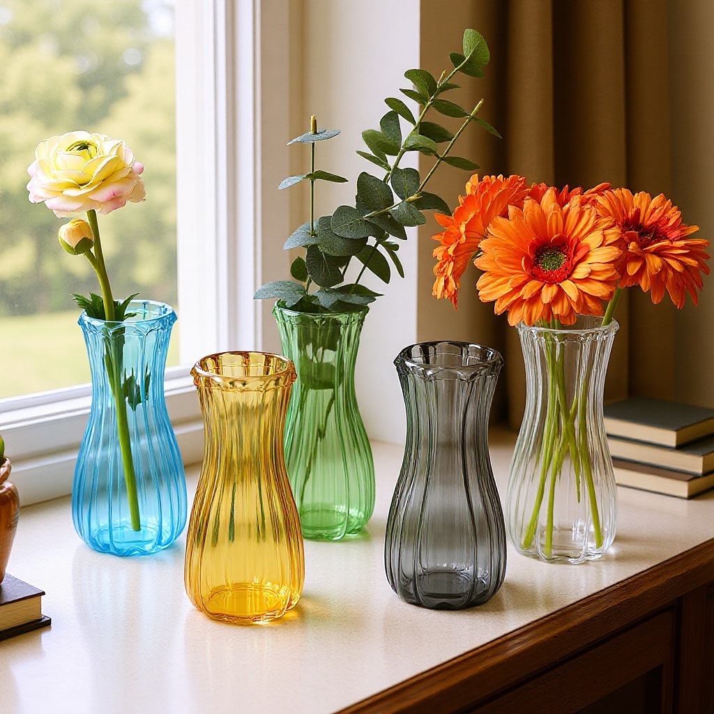 シンプルな縦稜ガラス花瓶創意カラー透明百合花器客間大サイズ水養生け花花瓶置物