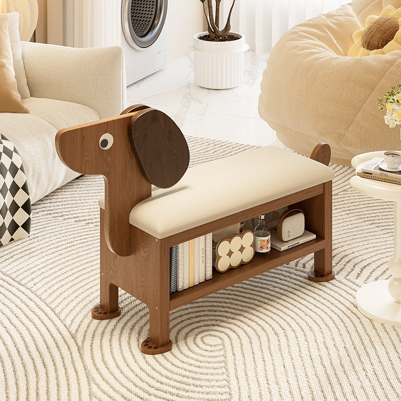 実木動物の腰掛けは家に入ります。かわいい子犬は靴を換えます。