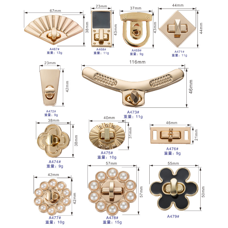 金属製の箱やバッグ用の金具、バッグ用アンティーク調金具、財布の開閉用ツイストロック、ピン付き金属製金具