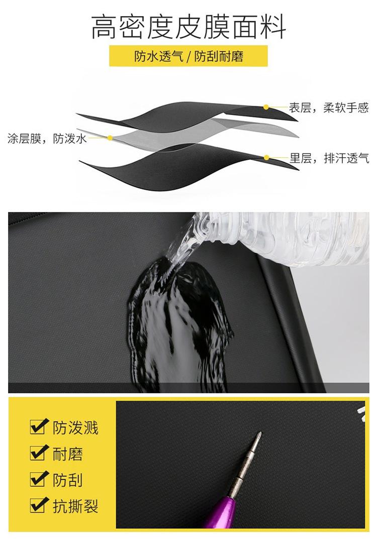 【产品材质】防泼水皮膜布(表面PU材质、底布是尼龙底布)