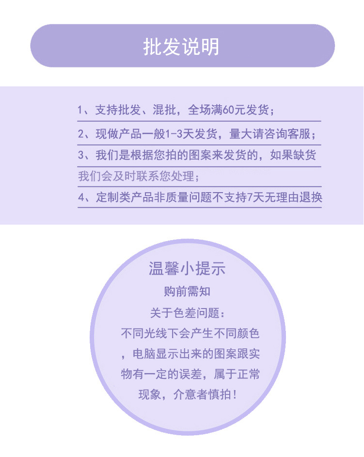 1、本店所有定做类的产品都是现做的 需要1-3天左右(视具体数量而定)发货的哦。 下单后 很快就会转到宝贝制作流程。所以制作过程中是不支持退货退款的哦!