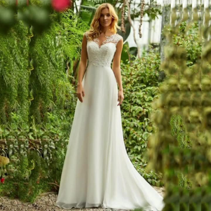法式轻婚纱礼服白色蕾丝V领亚马逊跨境新款婚纱主纱小拖尾长裙