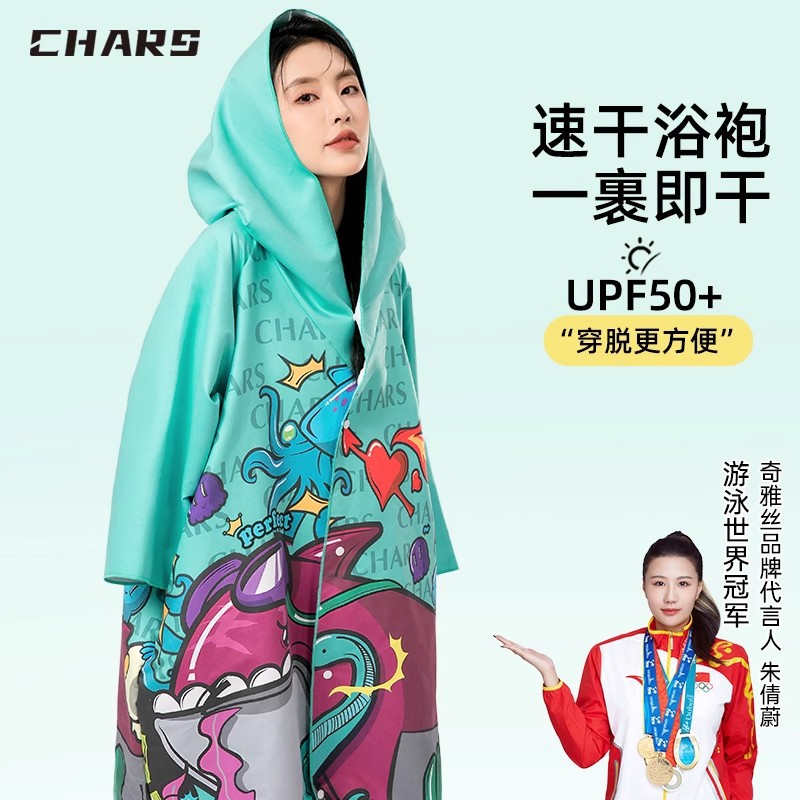 CHARS速干游泳浴巾开襟斗篷运动浴袍便携防晒连帽浴袍现货批发