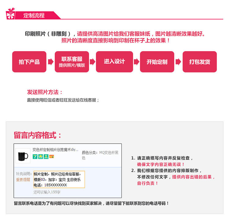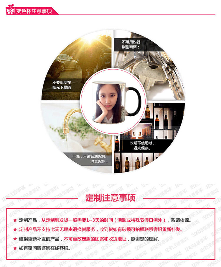 注:定制产品,一经制作,概不接受退款退货。易碎品,收货的时候切记当面验货,如有破损,马上拒收,并联系我们,可免费重新补发,如签收后发现的破损我们概不负责。